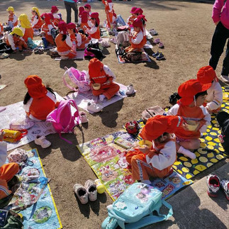 ひよこ組以上のお友達は園庭で、シートを敷いて頂きまーす😊白菜、チンゲン菜、水菜たっぷりの野菜も美味しく食べてました🍜